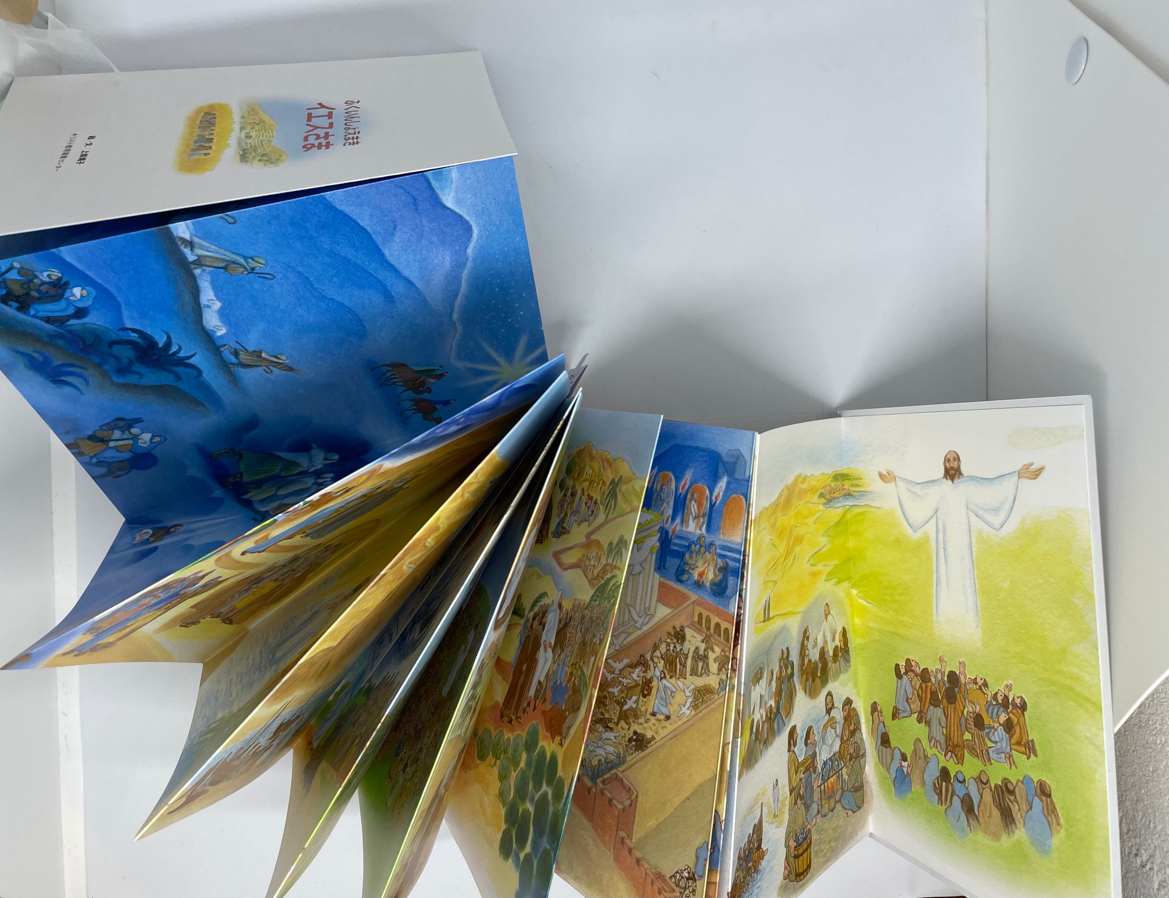 折り畳まれている、絵巻物スタイルの絵本です。